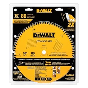 Dewalt DW3219PT 10-Inch 80T TCG Aluminum/Plastic/Fine Trim is made with premium Micro-Grain carbide that produces ultra-sharp cutting edges that dramatically reduce splintering. The precision balanced, laser-cut body provides extremely accurate cuts, while the exclusive dampening slots reduce vibration to enhance cutting accuracy. The tough coat finish reduces heat, friction, and gum to promote blade life.