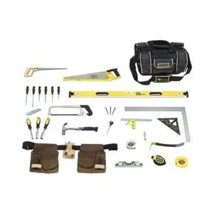 Set includes the following tools: 10-099 Retractable Knife; 15-088 Finish Saw Sharptooth 20" 12 Pt.; 15-100 Compass Saw Hardtooth 12" 8 Pt.; 15-265 Hacksaw 3-7/8"; 45-500 Carpenter Square Steel 16" x 24"; 46-053 Quick-Square Premium w/Adj Arm 6-3/4"; 46-123 Combination Square Prem Etched Blade 12"; 55-515 Wonder Bar 13-3/8"; 58-111 Nail Set 1/32" Square Head 4"; 58-112 Nail Set 2/32" Square Head 4"; 58-113 Nail Set 3/32" Square Head 4"; 60-001 Screwdriver Stanley Phillips 1 Pt.; 60-002 Screwdriver Stanley Phillips 2 Pt.; 60-003 Screwdriver Stanley 3/16" x 3" Standard; 60-004 Screwdriver Stanley 1/4" x 4" Standard; 60-005 Screwdriver Stanley 3/16" x 6" Standard; 60-006 Screwdriver Stanley 1/4" x 6" Standard; 69-122 Scratch Awl Stanley; 34-106 Stanley Long Tape 100' x 3/8"; 47-969 Plumb Bob 4 Oz Brass; 43-609 FatMax Xtreme Torpedo Level - 9"; 43-502 Level Fatmax Box Beam 48"; 47-480 FatMax Xtreme Chalk Reel; 16-975 Chisel Fatmax Short Blade 1/2"; 16-977 Chisel Fatmax Short Blade 3/4"; 16-978 Chisel Fatmax Short Blade 1"; 33-525 Powerlock Tape Rule 1" x 25'; 51-941 Hammer Antivibe Curved Claw 16 oz.; J95120 Apron 11 Packet Professional Construction; 501200M Fatmax Xtreme Tool Bag 19"